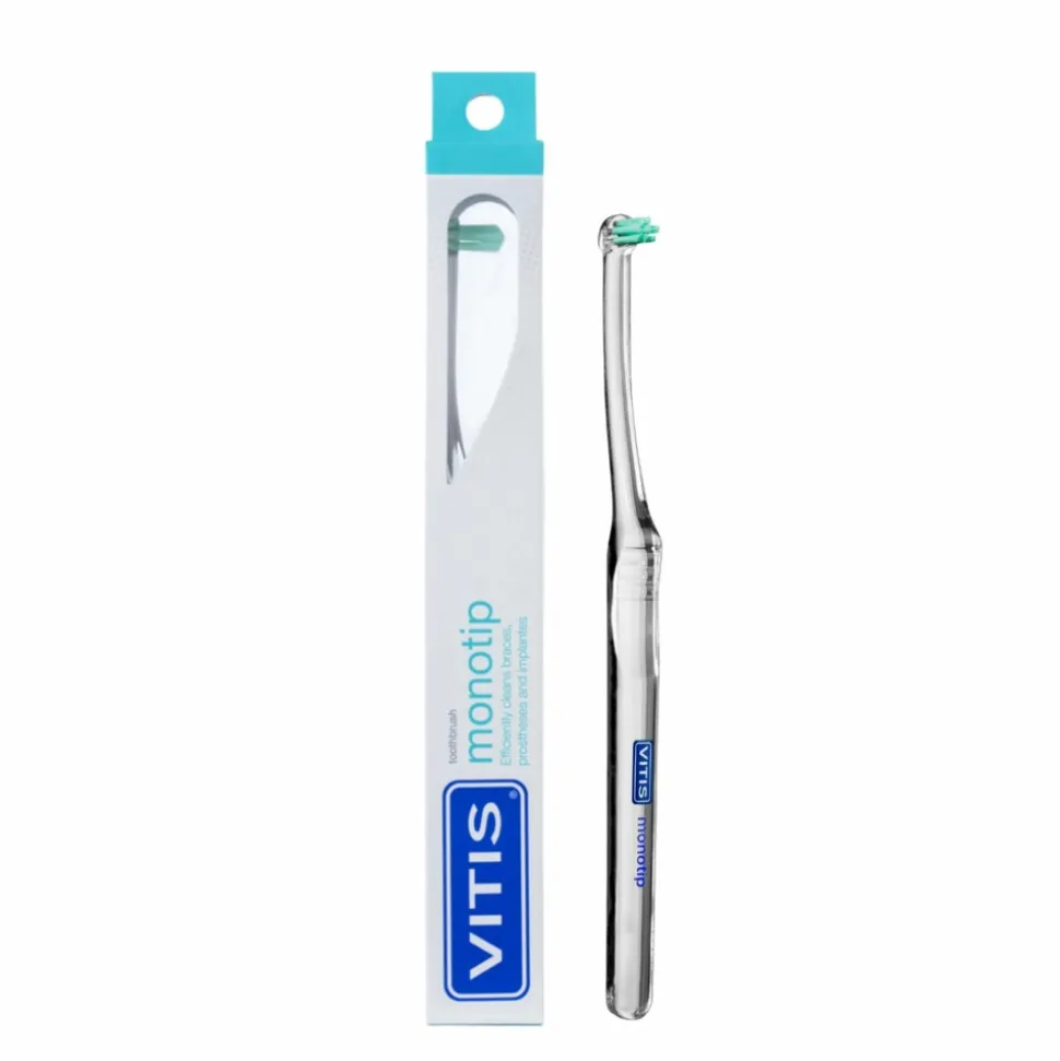 Met de Vitis Monotip kun je de moeilijke plaatsen in de mond poetsen. De zeer kleine borstelkop met singel tuft borstelharen maken gemakkelijk de kiezen schoon. De monotip is een aanvulling op de tandenborstel bij het tanden poetsen en bedoeld voor de reiniging van zeer moeilijk bereikbare plaatsen in de mond, zoals achter de laatste kiezen.