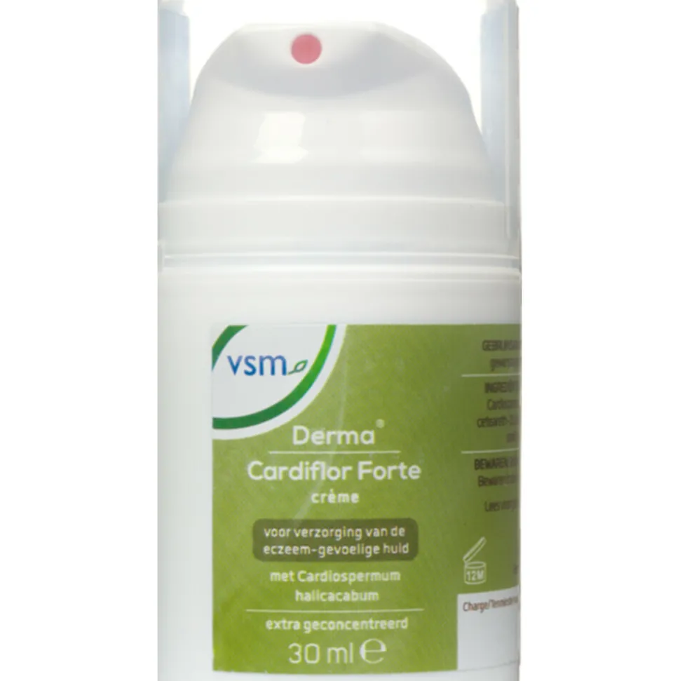 Derma Cardiflor Forte is een intensief verzorgende crème voor de eczeem-gevoelige huid. De crème bevat het natuurlijke ingrediënt Cardiospermum halicacabum en is extra geconcentreerd. Derma Cardiflor Forte crème heeft als eigenschap dat het makkelijk uitsmeert en snel intrekt. De crème geeft optimale hydratatie door de toevoeging van glycerol en is vrij van parfum.Cardiflor Forte crème zit in een handige en hygiënische pompflacon en is geschikt voor dagelijks, langdurig gebruik. Derma Cardiflor Forte crème is een plantaardig middel, ofwel zonder dierlijke ingrediënten. Geschikt voor alle leeftijden, ook voor baby’s.