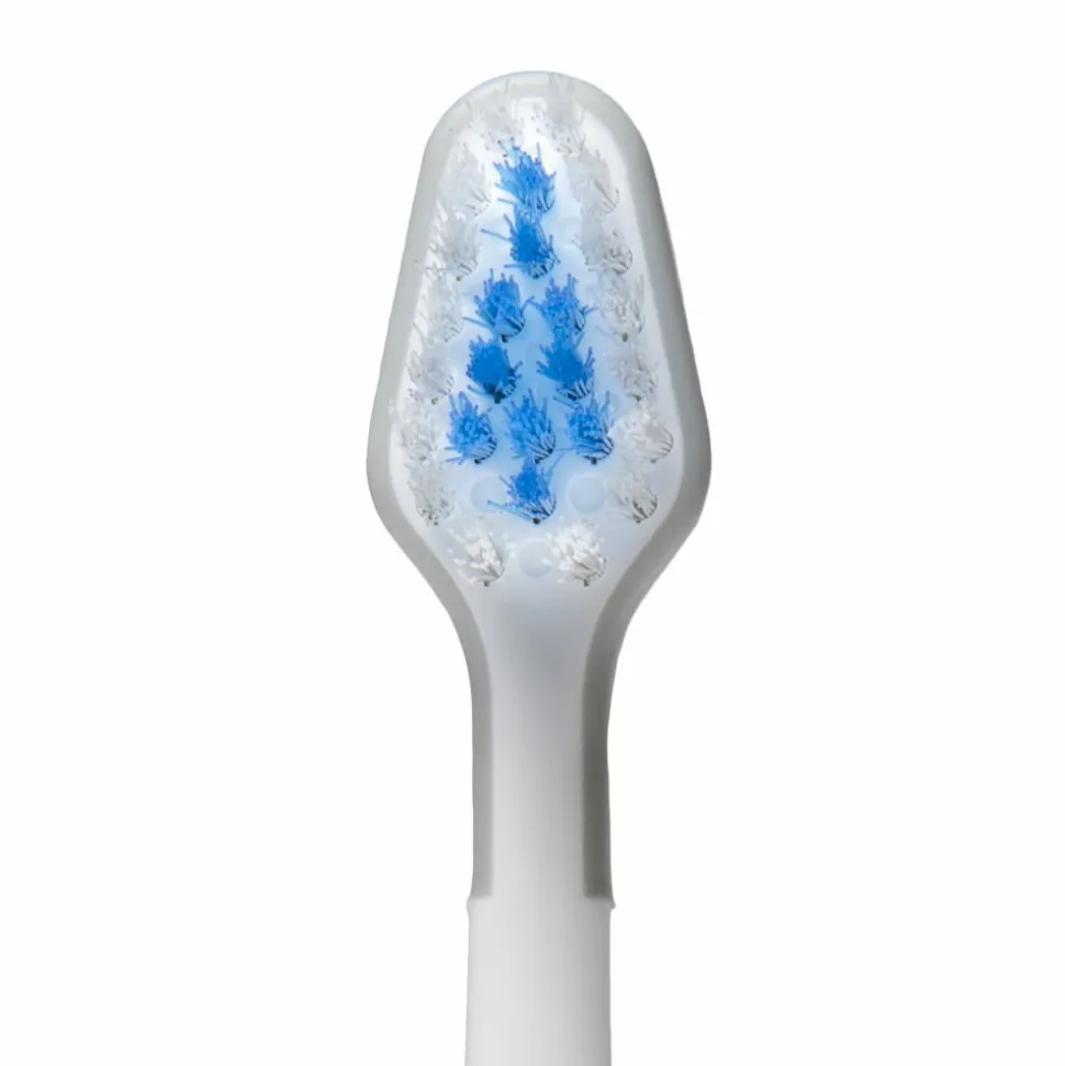 De witte Waterpik Triple Sonische Complete Care vervangende opzetborstels hebben een hoog-laagpatroon van zachte haren. Deze zorgt ervoor de plaque mild maar effectief verwijdert word op lastig te bereiken plaatsen. Het geavanceerde ontwerp van de opzetborstel bevat een ingebouwde tongschraper aan de achterkant, om de adem fris te houden. Advies is om elke 3 maanden de opzetborstel te vervangen. Dit zorgt voor een optimale doeltreffendheid van de opzetborstel. Het pakket bevat 3 vervangende opzetborstels met kleurcodering (kleuren van de voet kunnen variëren).