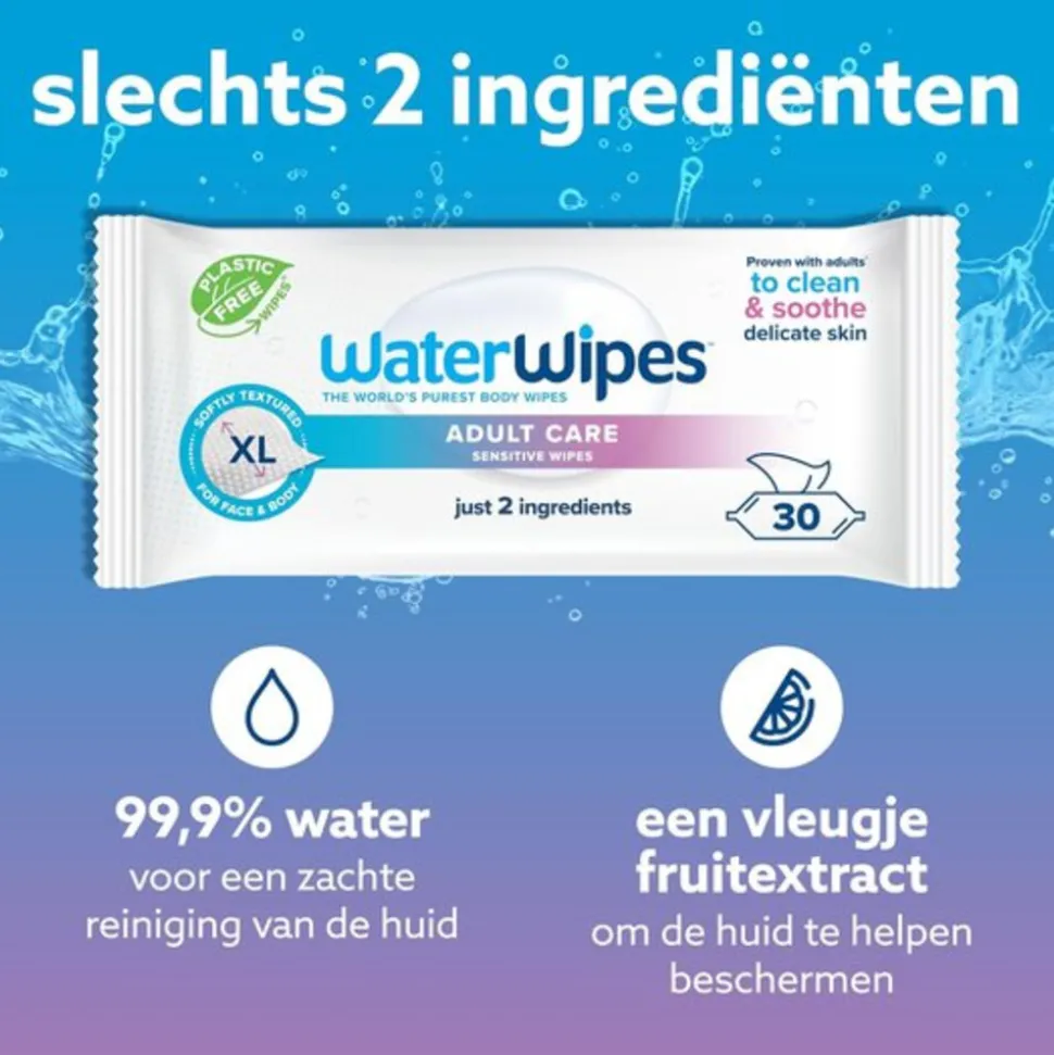 WaterWipes Volwassen Doekjes Sensitive zijn de perfecte keuze als je je huid op een natuurlijke manier wilt verzorgen. Met slechts 2 ingrediënten – 99,9% water en een druppel fruitextract – reinig je je lichaam, gezicht en intieme zones zacht en veilig. De extra grote doekjes zijn plasticvrij, biologisch afbreekbaar en geschikt voor dagelijks gebruik, zelfs bij een gevoelige huid. Zonder parfum, conserveringsmiddelen of andere chemicaliën: puur, zacht en duurzaam. Ideaal als alternatief voor katoen en water.