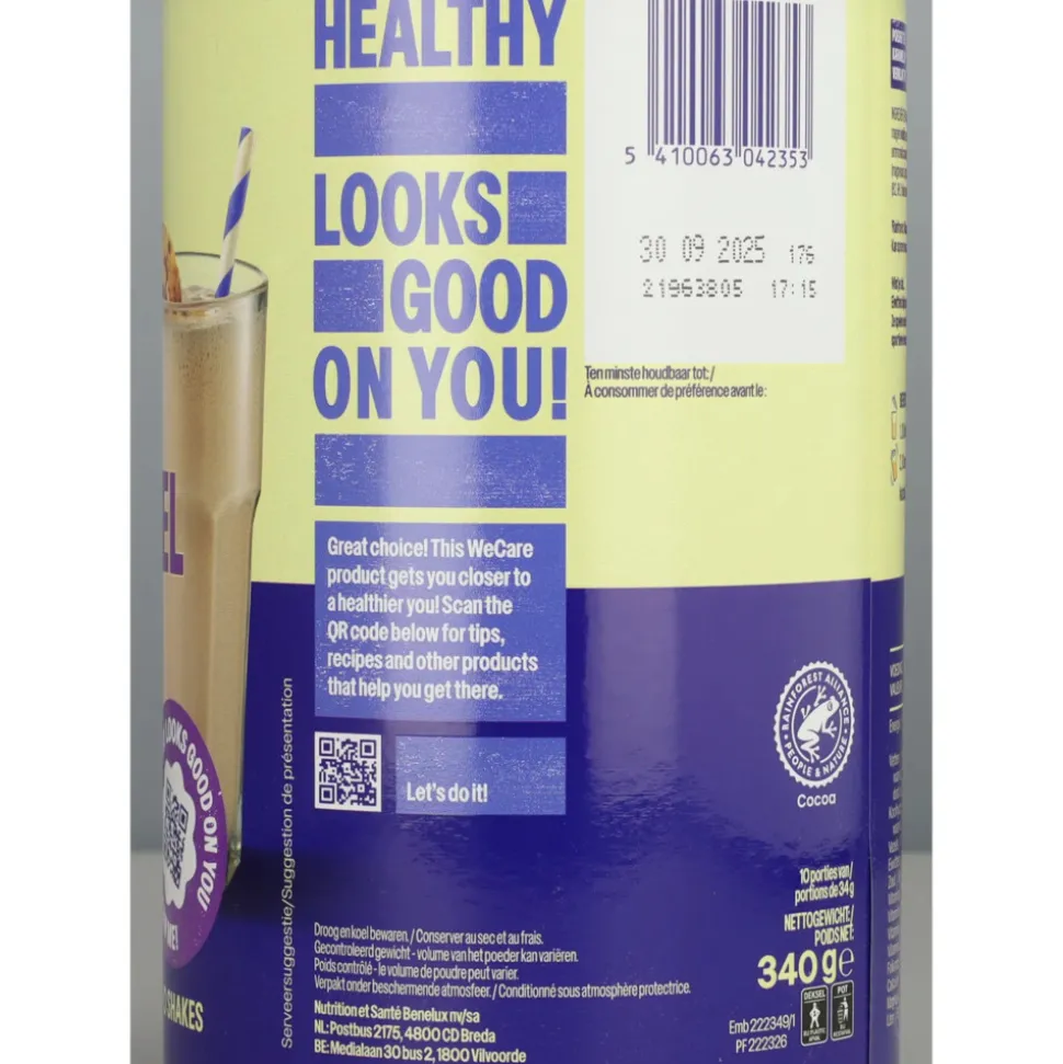 WeCare High protein Shake Cookies & Caramel shake bevat 20g eiwitten en is rijk aan vezels. Met 116 kcal per shake is die perfect voor na het sporten en tussendoor.