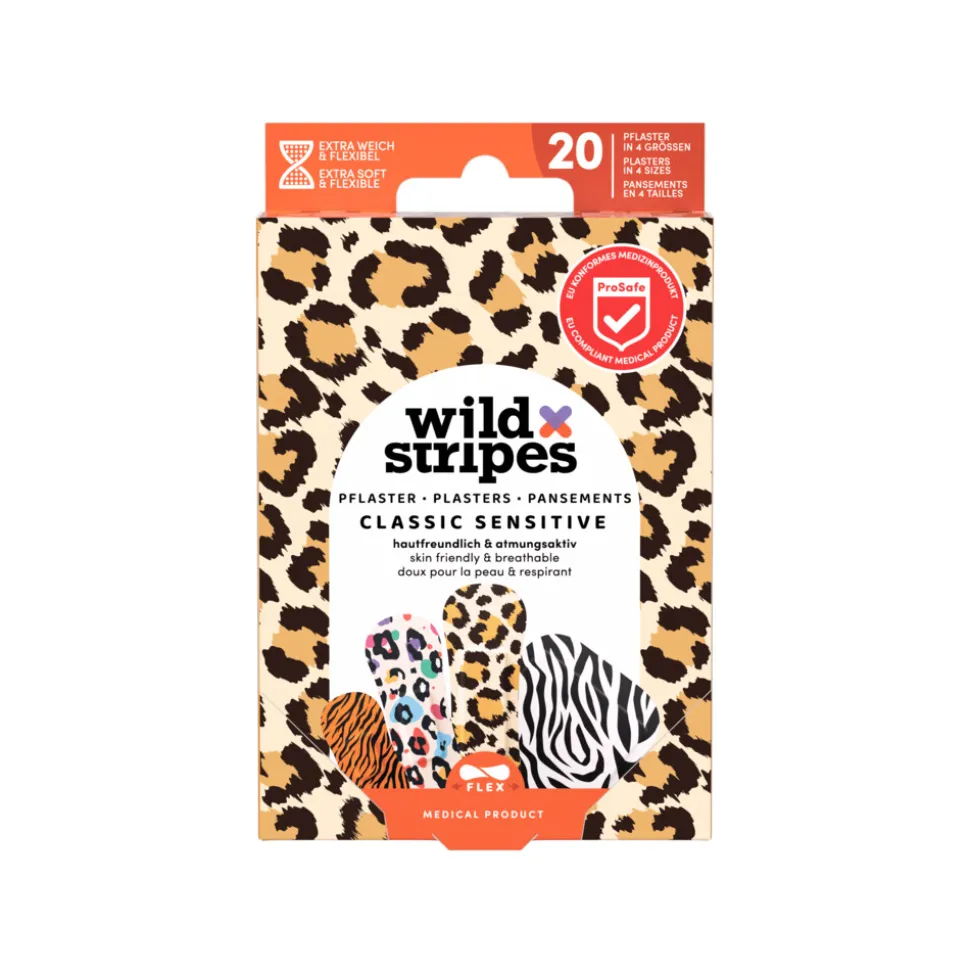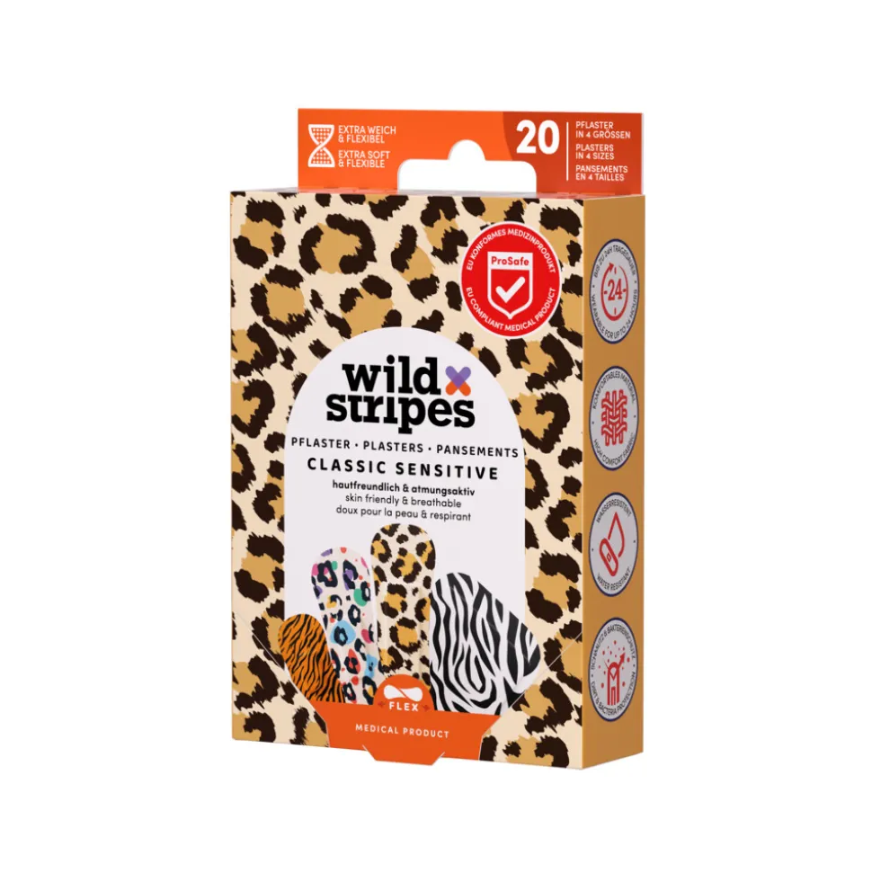 Ben je klaar voor wilde avonturen? Wild Stripes Classic Sensitive Animal is jouw EU-conform medisch product dat meer biedt dan alleen bescherming. Hypoallergeen en huidvriendelijk, biedt ons pleister supersterke bescherming tegen vuil en bacteriën. Waterbestendig en met een draagtijd tot 24 uur, is het verwijderen pijnloos. Onze unieke ontwerpen en gepatenteerde vormen bieden een stijlvolle bescherming voor kleine wonden. De wond en het gebied rondom de wond schoonmaken en drogen voordat de pleister waordt aangebracht. Het pleister van het beschermfolie losmaken. Het wondkussentje van de pleister boven de wond plaatsen en de plakstrips stevig aandrukken. Het pleister om de 24 uur vervangen of als deze te nat geworden is. Bewaren op een droge plaats en beschermen tegen direct zonlicht. Niet bewaren boven 25 °C.