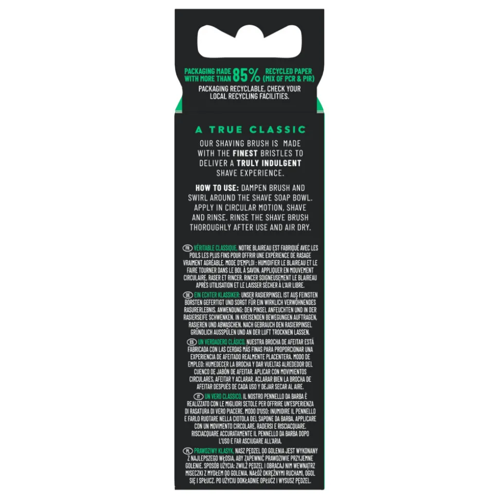 Ervaar een meesterlijke scheerbeurt met de Wilkinson Shave Brush Classic. Onze scheerkwast voor mannen heeft de fijnste haartjes voor een comfortabele scheerbeurt en geeft je het perfecte zachte gevoel terwijl je het scheerschuim aanbrengt. De haren zijn van niet-dierlijke vezels. De scheerkwast voor heren is gemaakt van de fijnste haren voor een echt klassieke en comfortabele scheerervaring. De klassieke scheerkwast scrubt de huid en zorgt voor dat perfecte zachte gevoel tijdens het aanbrengen van je scheerzeep of -crème. Het handvat van de scheerkwast is gemaakt van 90% gerecycled plastic en de verpakking is gemaakt van meer dan 85% gerecycled papier. De Wilkinson Shave Brush Classic is gemaakt in Duitsland.