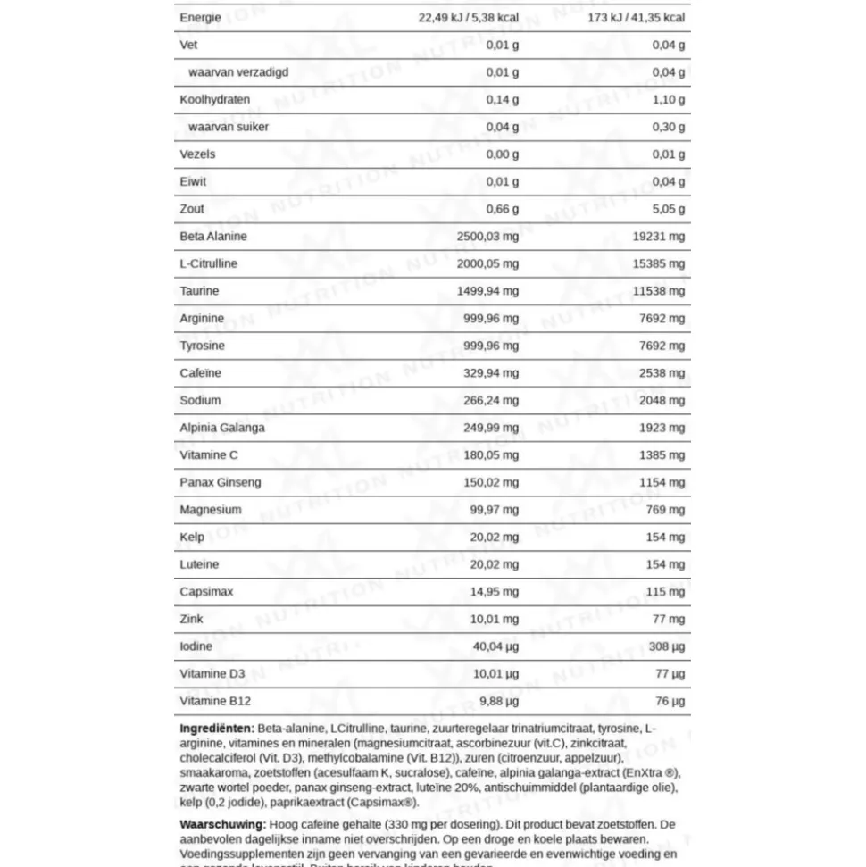 Beta-alanine, LCitrulline, taurine, zuurteregelaar trinatriumcitraat, tyrosine, L- arginine, vitamines en mineralen (magnesiumcitraat. ascorbinezuur (vit.C), Zinkcitraat, cholecalciferol (Vit. D3), methylcobalamine (Vit B12)), zuren (citroenzuur, appelzuur), smaakaroma, zoetstoffen (acesulfaam K, sucralose), cafeïne, alpinia galanga-extract (EnXtra@), zwarte wortel poeder, panax ginseng-extract, luteïne 20%, antischuimmiddel (plantaardige olie), kelp (0, 2 jodide), paprikaextract (Capsimax@).
