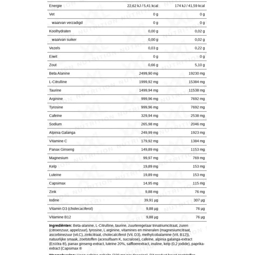 Beta-alanine, L-Citrulline, taurine, zuurteregelaar trinatriumcitraat, zuren (citroenzuur, appelzuur), tyrosine, L arginine, vitamines en mineralen (magnesiumcitraat)ascorbinezuur (vit.C), zinkcitraat, cholecalciferol (Vit. D3), methylcobalamine (Vit. B12), natuurlijke smaak, zoetstoffen (acesulfaam K, sucralose), cafeïne, alpinia galanga-extract (EnXtra @), panax ginseng-extract, luteïne 20%, saffloerextract, inuline, kelp (0, 2 jodide), paprika- extract (Capsimax @)