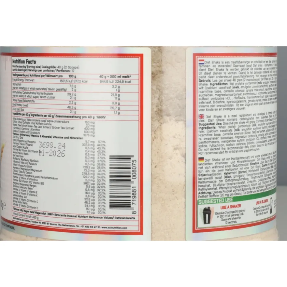 Wei proteïne concentraat (melk, emulgator: zonnebloemlecithine), boekweitvlokken, zoja eiwit isolaat, havermeel (gluten), melkeiwit (calcium caseïnaat (melk, emulgator: zonnebloem-lecithine), geraffineerde sojaolie (melk), wei eiwit isolaat (melk, emulgator: zonnebloemlecithine), l-carnitine base, camelia sinesis (groene thee-extract), kaliumcitraat, calciumsulfaat, calciumzouten van orthofosforzuur, trinatriumcitraat, zoetstof: sucralose, magnesiumcarbonaat, ascorbinezuur, nicotinamide, ijzer-3-pyrofosfaat, DL-alfa-tocoferylacetaat, zinksulfaat, calcium-D-pantothenaat, mangaansulfaat, pyridioxine HCL, riboflavine, thiaminemononitraat, koper-2-sulfaat, retinylacetaat, pteroylmonoglutaminezuur, kaliumjodaat, fytomenadion, natriumselenaat, D-biotine, cyanocobalamine, gemalen kaneel, cookies & cream aroma.