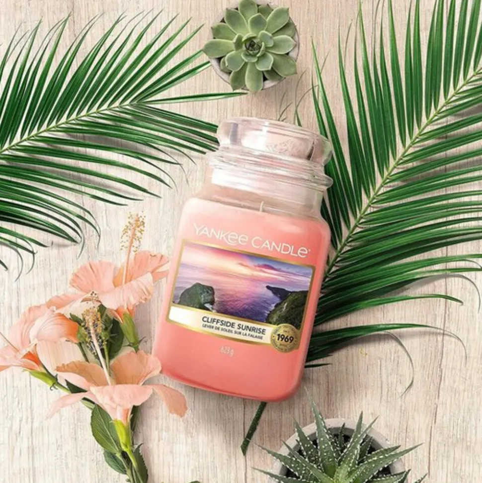 - De Yankee Candle Geurkaars Large Jar Cliffside Sunrise neemt je mee naar een prachtige zonsopgang op een klif, waardoor je een betoverende geurervaring krijgt.