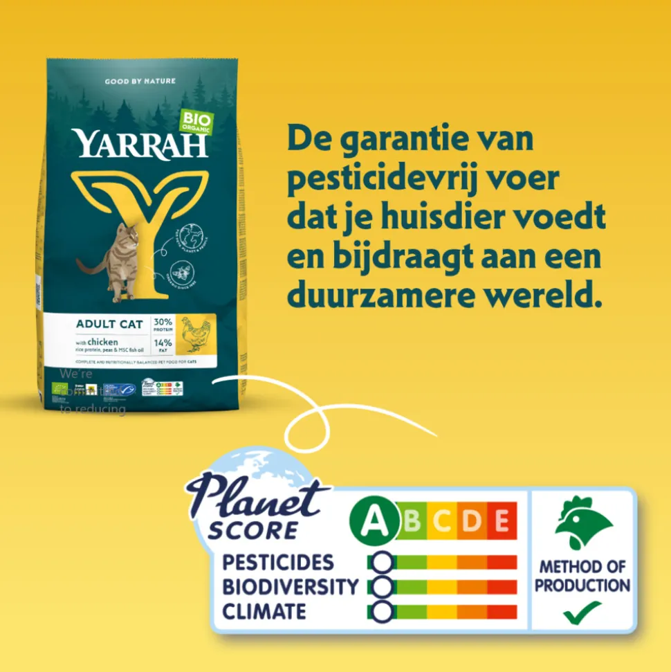 Yarrah biologisch kattenvoer is een krokant brokje met biologische kip en erwten, voor volwassen katten. Het biologische kattenvoer vormt een complete, voedzame en zeer smakelijke maaltijd voor je kat. Zuiver biologisch voer en dus vrij van chemische geur-, kleur- en smaakstoffen, pesticiden en GMO, waarbij de best opneembare eiwitten zijn geselecteerd. Zo krijgt je kat precies binnen wat hij nodig heeft.
