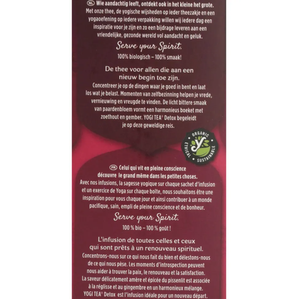 Deze Ayurvedische kruidenthee met zoethout, paardenbloem en kaneel reinigt, regenereert en geeft een nieuwe start. Yogi Tea Detox bevat een melange van kruiden en specerijen die traditioneel al eeuwenlang de reiniging ondersteunen.
