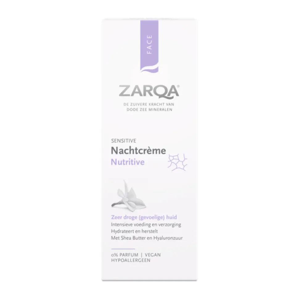 Deze Zarqa Nachtcrème Nutritive is een rijke volle nachtcrème die de droge tot zeer droge (gevoelige) huid intensief voedt. Het zorgt ’s nachts voor een natuurlijk herstel en beschermt op krachtige wijze tegen uitdroging en schadelijke invloeden van buitenaf. Dode Zee Mineralen, Shea Butter, Hyaluronzuur en Vitamine E herstellen ruwe, schrale en schilferige plekjes. Het maakt de huid zacht en soepel.