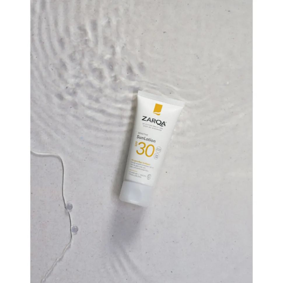 ZARQA SunLotion SPF30 – met huid- en milieuvriendelijke UVA/UVB filters – is zonbescherming met hoge spf voor intensieve bescherming van zelfs de meest gevoelige huid. De parfumvrije en waterbestendige formule smeert prettig, trekt snel in, plakt niet en laat geen witte waas achter.
