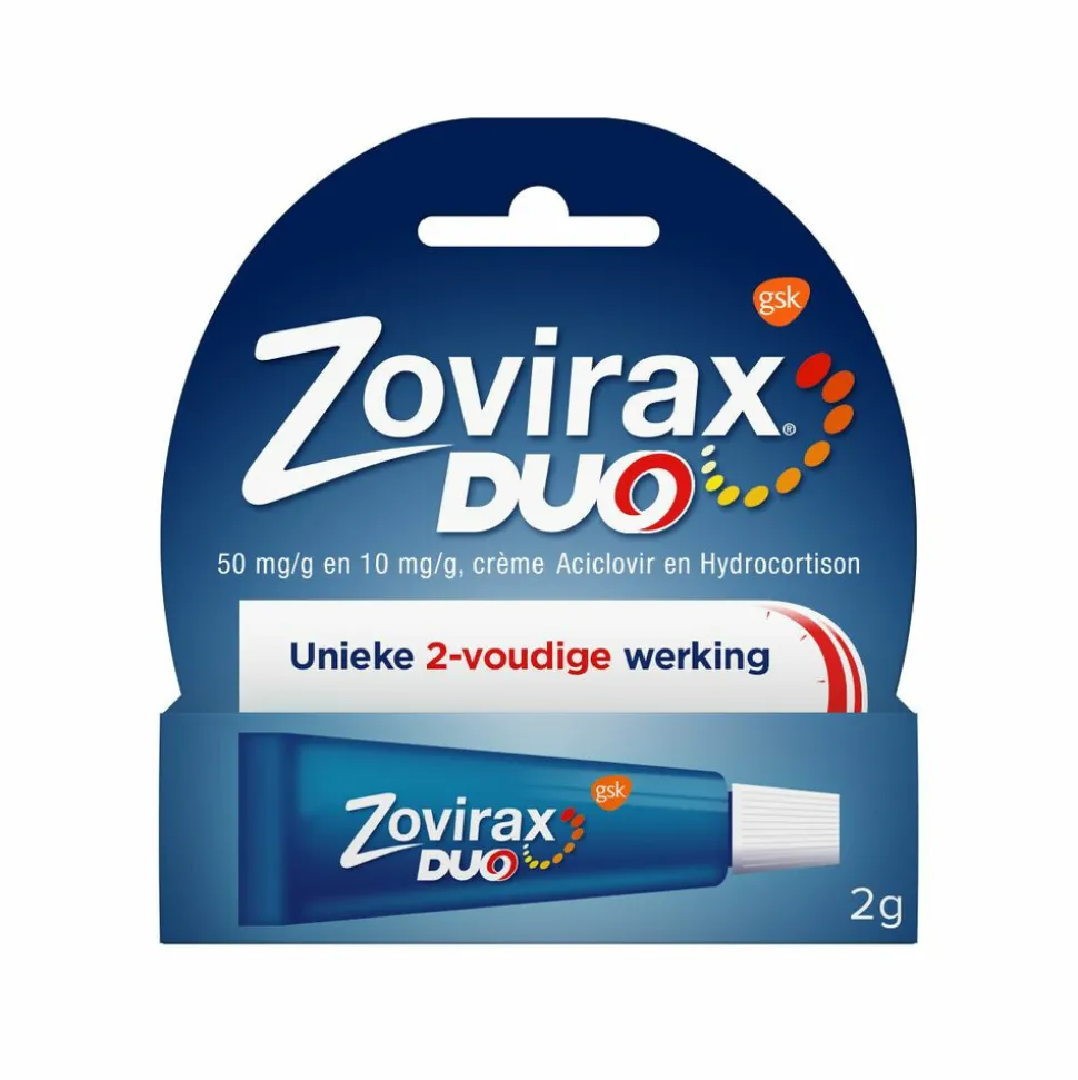 Zovirax Duo koortslipcrème is een dubbelwerkende formule. Het combineert een antiviraal middel (aciclovir) en ontstekingsremmer (hydrocortison). Zovirax Duo koortslipcrème remt het herpes simplex-virus dat de vorming van koortsblaasjes veroorzaakt, het remt de ontsteking* en het bestrijdt de symptomen van een koortslip. Gebruik Zovirax Duo bij de eerste symptomen van een koortslip (tinteling, roodheid, zwelling) om de kans op de ontwikkeling van een koortslip te verminderen.
